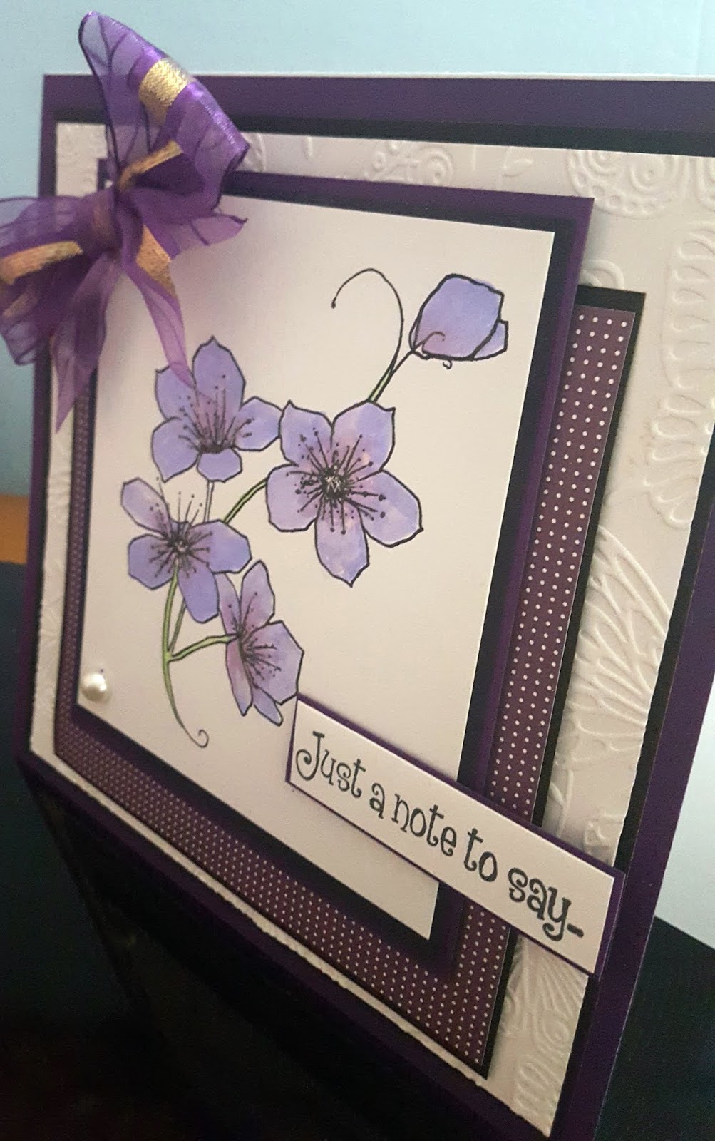 made my own sentiment and mattered and layered on a few different colours of blue card, dottie ribbon available from crafty ribbons.